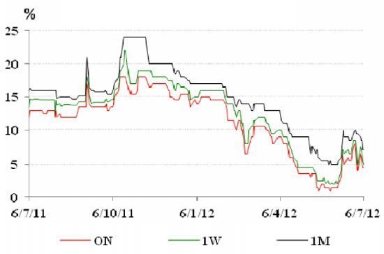 Dữ liệu thống kê cho thấy, quý 2/2012, quy mô giao dịch bình quân bằng VND trên liên ngân hàng giảm nhanh và ổn định từ 22.000 - 26.000 tỷ đồng/ngày, không còn phổ biến trên 30.000 - 50.000 tỷ đồng/ngày như trước đó. Đặc biệt lãi suất bình quân nhận được giảm rất mạnh, nhất là trong tháng 5, chỉ xoay quanh 3 - 5%/năm ghi nhận ở các kỳ hạn ngắn (nhóm kỳ hạn chiếm tỷ trọng chi phối). Thậm chí có nhiều giao dịch được gọi là “như cho không”, khi lãi suất dưới cả 1%/năm, hay mốc 0,5%/năm mà Thống đốc Ngân hàng Nhà nước Nguyễn Văn Bình dẫn chứng khi giải trình trước Quốc hội.