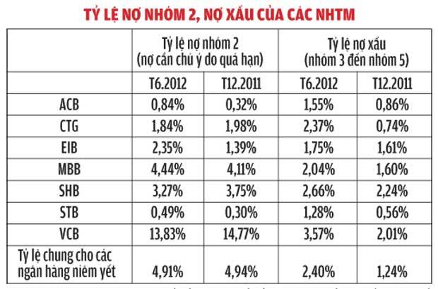 Tỷ lệ nợ xấu của các NHTM được công bố đều tăng so với cuối năm 2011. Tuy nhiên, nhiều khả năng đây vẫn chưa phải các con số cuối cùng do sự linh hoạt trong cách phân loại nợ, nên các NHTM theo cách hạch toán của riêng mình có thể vẫn có nhiều khoản nợ chưa chuyển thành nợ quá hạn và nợ có khả năng mất vốn.