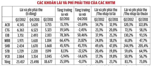 Nếu so với cùng kỳ quý 2/2011 thì giá trị các khoản lãi và phí phải thu tăng tới 25,59%. Và quan trọng hơn, các tỷ lệ “lãi và phí phải thu trên thu nhập từ lãi” cũng như “lãi và phí phải thu trên thu nhập lãi thuần” cũng đều tăng lên. Điều này có nghĩa là nhiều khoản lãi phải thu mà các NHTM có thể rất khó thu được, cũng đã được các NHTM hạch toán vào thu nhập từ lãi để làm tăng lợi nhuận trong quý 2 vừa rồi.