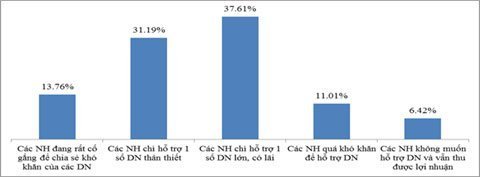 Sự giúp đỡ của các ngân hàng là hạn chế. Trong khi dòng vốn tín dụng cho doanh nghiệp vẫn còn đang là vấn đề nóng bỏng, các doanh nghiệp đã được hỏi về ý kiến của họ về hoạt động của các ngân hàng đối với cộng đồng doanh nghiệp. Quan điểm của phần lớn doanh nghiệp là các ngân hàng chỉ hỗ trợ các doanh nghiệp lớn và có lãi (38%), hoặc các doanh nghiệp thân thiết (31%). Số đông các doanh nghiệp còn lại cho rằng các doanh nghiệp vẫn đang cố gắng hỗ trợ doanh nghiệp tuy nhiên một số ngân hàng quá khó khăn để có thể giúp đỡ doanh nghiệp. Chỉ có một số ít doanh nghiệp có quan điểm không thông cảm với các ngân hàng và cho rằng các ngân hàng đang không thực sự muốn hỗ trợ và vẫn muốn thu được nhiều lợi nhuận.
