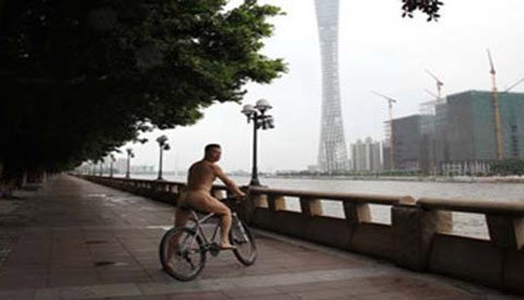 "Hàng khủng" hơn, Ou Zhihang, ông chủ đình đám của Đài truyền hình Quảng Đông (Trung Quốc) đã khiến bàn dân thiên hạ được phen “nổ đom đóm mắt” khi trần như nhộng, thong dong trên một chiếc xe đạp, diễu khắp thành phố. Mục đích duy nhất của đại gia này là kêu gọi người dân bảo vệ môi trường.