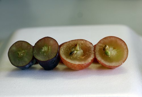 | Khi bổ ra, nho Mỹ nhìn rất chắc thịt và không có hạt (trái) trong khi nho đỏ Trung Quốc có nhiều hạt và ruột khá rỗng, bóp vào thấy rất nhão (phải) |