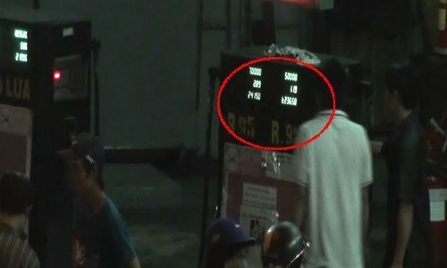 Tối 28-8, tại cây xăng này tấp nập người ra vào đổ xăng. 19g34, một phụ nữ chạy xe Wave tấp vào, đưa năm ngón tay ra hiệu đổ 50.000 đồng xăng A92 (tương đương 2,11 lít). Khi khách vừa cúi xuống mở cốp xe thì nhân viên mặc áo trắng bước tới thu tiền, nói chuyện đánh lạc hướng. Khi chỉ số tiền trên bảng điện tử nhảy đến 40.000 đồng (chỉ số xăng là 1,69 lít), nhân viên mặc áo carô màu đen trắng đứng nép cạnh trụ xăng nhanh tay bấm khống số tiền lên 50.000 đồng, trong khi chỉ số xăng không đổi. Như vậy, người khách vừa bị ăn gian tới 10.000 đồng.