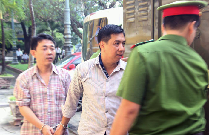 Các bị cáo được dẫn giải tới tòa, bị cáo Hùng và Cường bị còng tay, áp giải đến tòa.