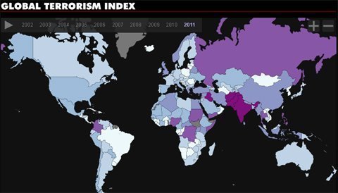 | Bảng xếp hạng khủng bố toàn cầu, theo đó, các nước có màu trắng ít hoặc không bị khủng bó, còn các nước có màu đậm dần có nguy cơ khủng bố nhiều hơn. |