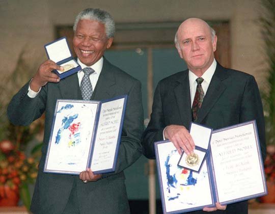 Nelson Mandela và Friedrich de Klerk nhận giải thưởng Nobel Hòa bình vào ngày 10 tháng 12 năm 1993.