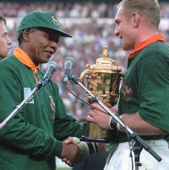 Mandela xuất hiện trong bộ đồng phục của đội tuyển Nam Phi tại trận chung kết Giải bóng bầu dục thế giới ở Johannesburg để chúc mừng đội nhà tháng 1 năm 1995.