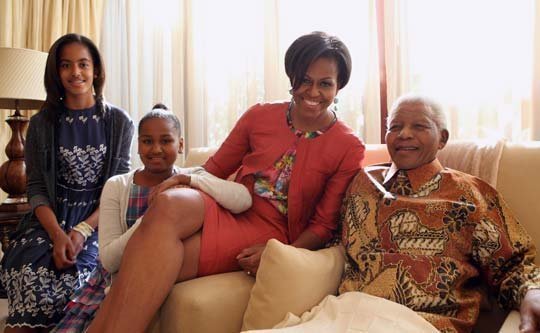 Đệ nhất phu nhân Mỹ Michelle Obama và hai cô con gái Malia (trái) và Sasha (phải) tới thăm nhà lãnh tụ Nam Phi tại nhà riêng của ông ở Houghton, Nam Phi tháng 6 năm 2011.