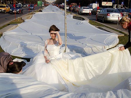 Một người mẫu đang trình diễn chiếc váy cưới có đuôi dài nhất thế giới (gần 3km) tại thủ đô của Romania hôm 20 tháng 3.