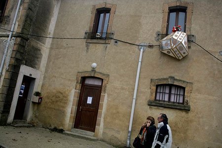 Hai du khách đi ngang qua một mô hình tượng trưng cho UFO (vật thể bay không xác định) được treo trên một khung cửa sổ tại Bugarach.
