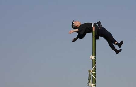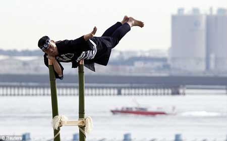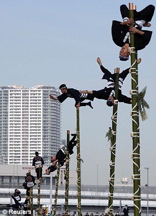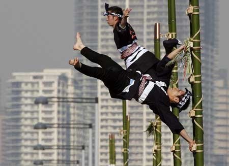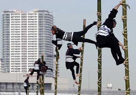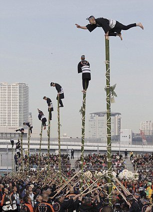 Những nhân viên cứu hỏa đứng thăng bằng trên các cột tre và đối mặt với chướng ngại vật nguy hiểm bên dưới là một phần của màn trình diễn thường niên đã có lịch sử ít nhất ba trăm năm tại Nhật Bản.