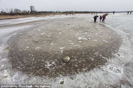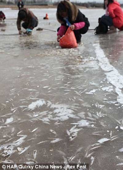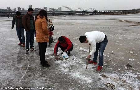 Những người dân ở thành phố Tây An, thủ phủ của tỉnh Thiểm Tây (Trung Quốc) đã vô cùng thích thú khi nhận ra rằng họ có thể nhặt cá miễn phí từ một dòng sông bị đóng băng.