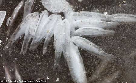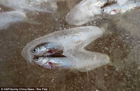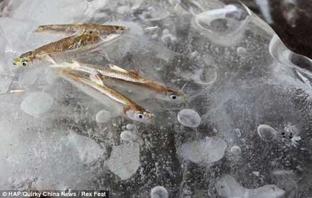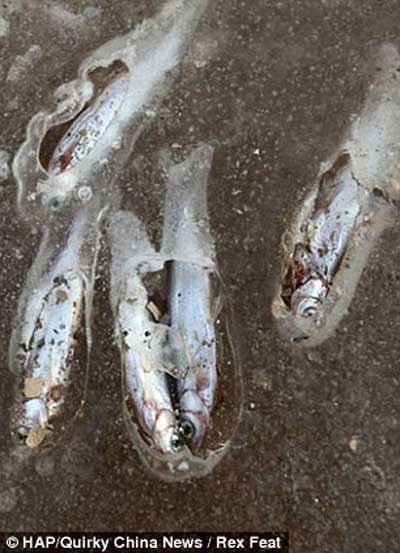 "Vì nhiệt độ xuống thấp và nước nông nên những con cá đã bị mắc kẹt trong dòng nước bị đóng băng," một người cho biết.