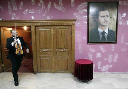 Một thành viên trong Dàn nhạc Giao hưởng Quốc gia Syria mang theo nhạc cụ của mình khi đi gần một áp-phích in hình Tổng thổng Bashar al-Assad.