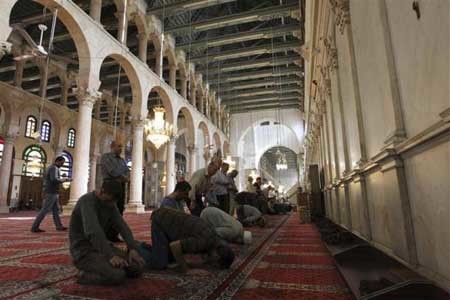 Những người đàn ông cầu nguyện tại nhà thờ Hồi giáo Umayyad ở Damascus.