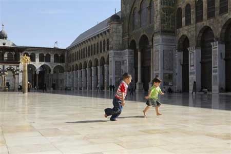 Hai em nhỏ đang chơi đùa trước nhà thờ Hồi giáo Umayyad.