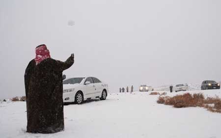 Một người đàn ông đang nghịch tuyết trên sa mạc gần Tubuk, Ả rập Xê-út. (Ảnh: Reuters)
