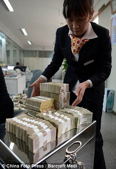 Các nhân viên giao dịch tại một ngân hàng ở Trịnh Châu, Trung Quốc đã không khỏi tất bật sau khi một khách hàng chở 13 bao tiền giấy và 2 túi tiền xu tới gửi.