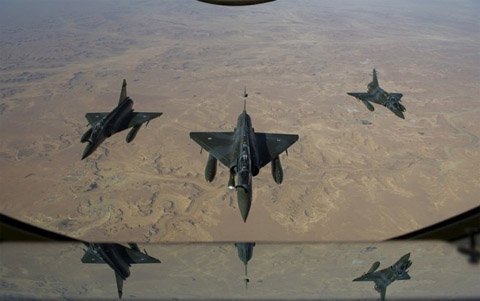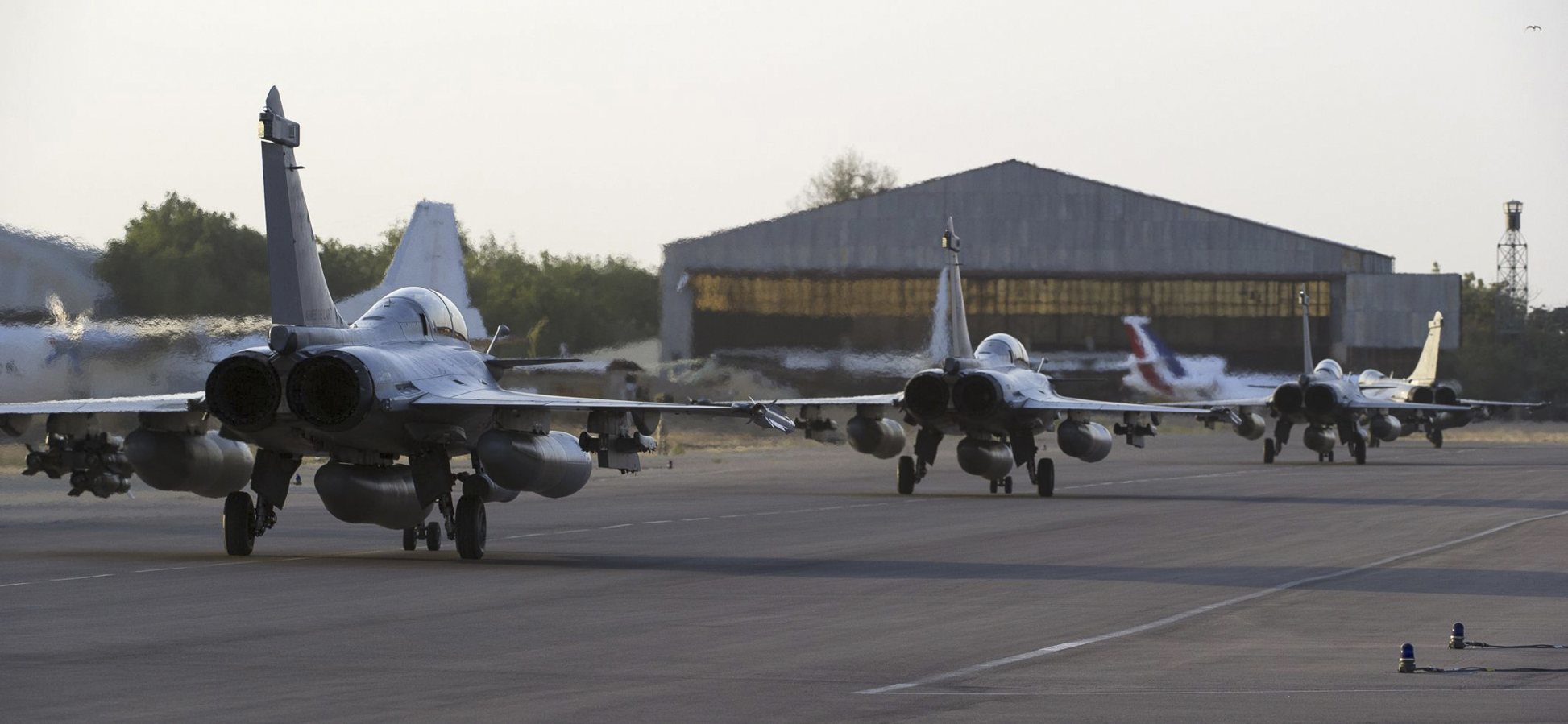 Ba chiếc máy bay chiến đấu Mirage 2000D của Pháp bay qua vùng N'Djamena, Chad.