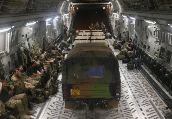 Các binh sĩ và khí tài của Pháp được vận chuyển trên chiếc máy bay vận tại Không lực Hoàng gia C17
