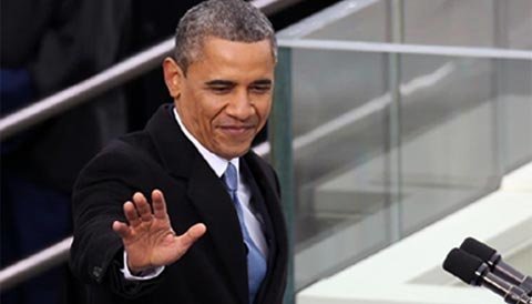 Tổng thống Barack Obama giơ tay chào trước khi phát biểu trong lễ nhậm chức nhiệm kỳ 2. (Ảnh: Getty) |