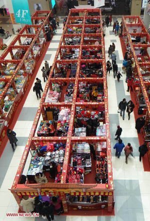 Khách hàng lựa chọn các sản phẩm thủ công tại một siêu thị ở Bắc Kinh, thủ đô Trung Quốc. Các thương nhân bán lẻ trên khắp đất nước tỷ dân này đã tung ra nhiều mặt hàng như một cách để thu hút người tiêu dùng khi dịp Tết Nguyên Đán đang tới gần.