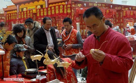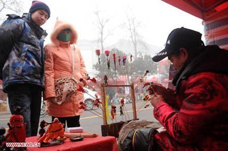 Mọi người đứng xem người thợ thủ công làm những con tò he tại khu chợ ở Thạch Gia Trang, tỉnh Hồ Bắc.