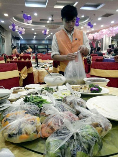 Một nhân viên đang gói thức ăn thừa sau tiệc cưới tại một nhà hàng ở Nam Ninh, khu tự trị dân tộc Choang, Quảng Tây, Trung Quốc.