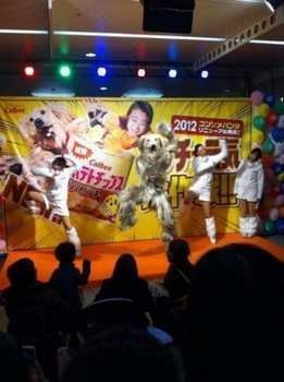 Một người đàn ông đưa thú bông hình sư tử giả vờ bú sữa từ hình nộm một con bò sữa.