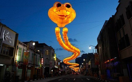 Những chiếc đèn lồng được xếp thành hình rắn được treo dọc một con phố tại Singapore trước Tết Nguyên Đán. (Ảnh: Reuters)