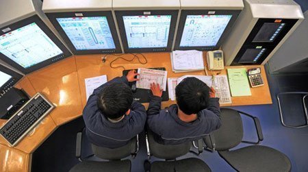 Các kỹ thuật viên tại phòng điều khiển chính của tổ máy phát điện số 1.