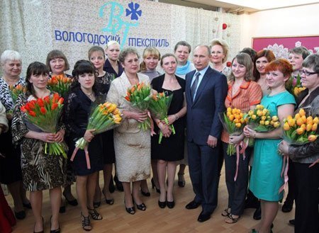 Tổng thống Nga Vladimir Putin chụp ảnh với các công nhân nhà máy dệt Vologda vào Ngày Quốc tế Phụ nữ tại Vologda.