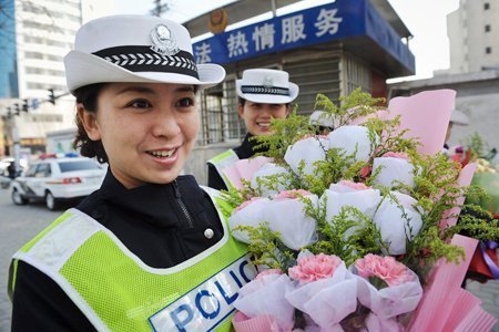 Nữ cảnh sát giao thông Zhou Jinyan và đồng nghiệp của mình nhận được hoa từ người dân trước ngày 8/3 tại thành phố Fuyang, tỉnh An Huy, Trung Quốc.