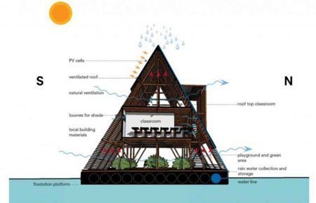 Công trình 3 tầng sẽ nổi trên mặt nước với chân đế được làm từ 256 thùng nhựa. Trường học nổi được thiết kế để đón nhận khoảng 100 học sinh. Ngoài ra, trong trường cũng có cả sân chơi và không gian xanh.