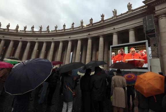 Các tín đồ Công giáo cầm ô che mưa để theo dõi buổi bỏ phiếu qua màn hình ở quảng trường St. Peter, Vatican.