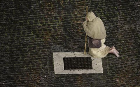 Một người hành hương chờ đợi bên ngoài quảng trường St. Peter, Vatican trong khi các hồng y bỏ phiếu trong nhà nguyện.
