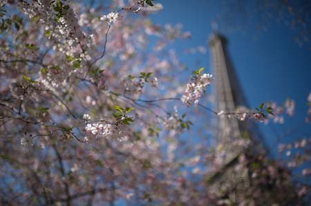 Hoa anh đào nở gần tháp Eiffel, Pháp.