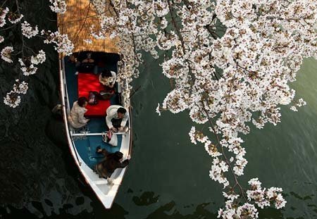 Các du khách đi thuyền dưới một cây anh đào nở rộ hoa tại công viên Sakuranomiya ở Osaka, Nhật Bản.