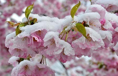 Tuyết bao phủ những cánh hoa anh đào tại sân vận động Olympic Munich, Đức.