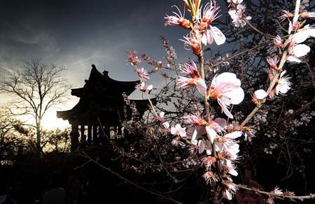 Những cây anh đào được trồng trước một ngôi chùa ở công viên Yuyuan Tan, Bắc Kinh, Trung Quốc.