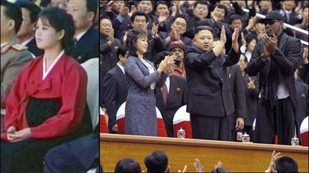 Trông phu nhân Ri Sol-ju đã thon gọn hơn (ảnh phải) khi đón tiếp cựu ngôi sao bóng rổ Mỹ Dennis Rodman hồi tháng trước. |