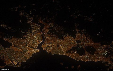 | Khung cảnh Istanbul, Thổ Nhĩ Kỳ về đêm phân định rõ hai nửa Âu - Á |