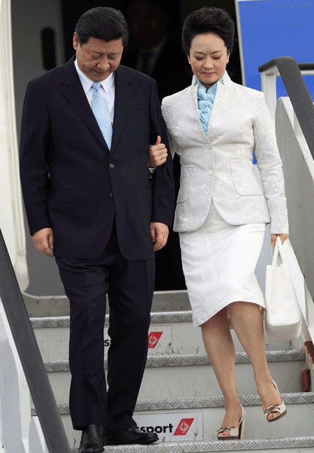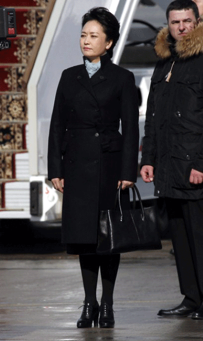 Vào thời điểm mà đệ nhất phu nhân Trung Quốc Bành Lệ Viện chuẩn bị lên đường cùng chồng công du sang Nga hôm thứ Sáu tuần qua, bà mặc một chiếc áo khoác màu xanh tím than sẫm, chiếc khăn lụa quàng cổ màu xanh ngọc rất ‘hợp tông’ với chiếc túi xách.