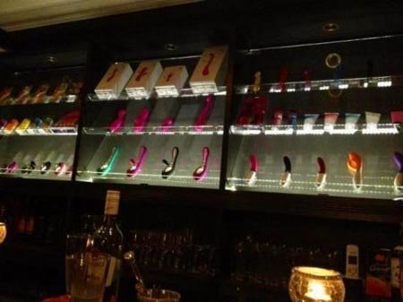 Hơn 50 loại dụng cụ kích dục dành cho phụ nữ được trưng bày trên giá sau quầy bar. |