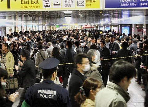 Các khu vực ở Tokyo thường đông nghịt nhân viên công sở trước kia nay khá yên tĩnh. Các công ty cho phép nhân viên ở nhà. Người ta xếp thành hàng dài ở các sân bay.