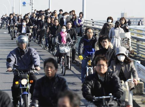 Người dân từ bên ngoài Tokyo đi qua một cây cầu. (Ảnh: AP)