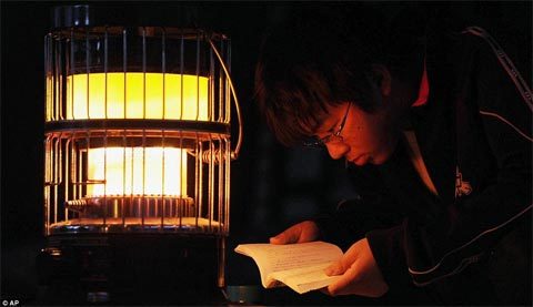 Một học sinh sơ tán đang đọc sách trong ánh sáng của bếp dầu tại một điểm trú tạm ở Ofunato. (Ảnh: AP)