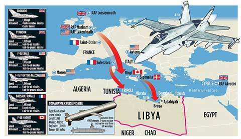 Báo hiệu cho cuộc tấn công của quốc tế nhằm vào Libya, máy bay chiến đấu Pháp đã cất cánh từ chiều khỏi căn cứ Saint-Dizier ở đông nước Pháp và khai hỏa đầu tiên.