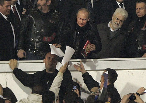 ngồi bên phải. Khi người xem hô vang tên ông, Thủ tướng Putin đứng dậy vẫy tay,