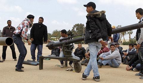 Các tay súng tình nguyện tập bắn đạn cối ở Benghazi. (Ảnh: Reuters)